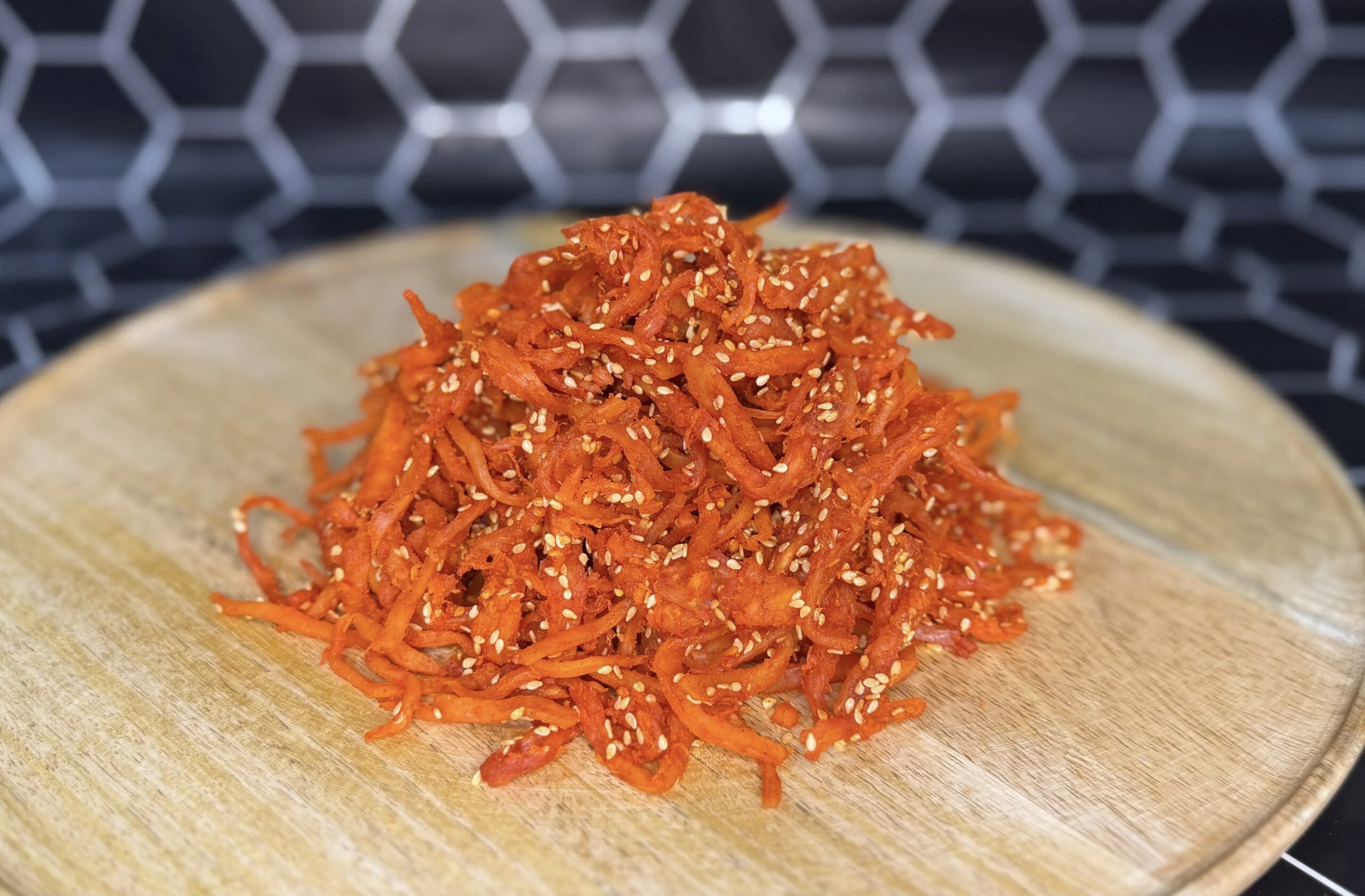 Популярний гострий снек із сушеного кальмара, нарізаного тонкою стружкою. Він приправлений спеціями, червоним перцем та кунжутом, має пікантний солодко-гострий смак, мʼяку скоринку та ніжне м’ясо всередині. Ідеально підходить як закуска до пива чи інших напоїв, натхнений азійськими кулінарними традиціями.