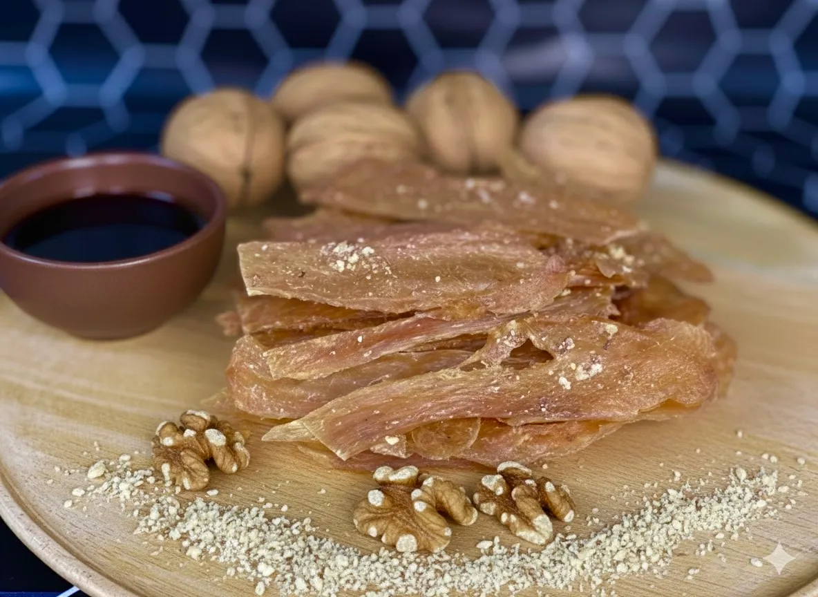 Соковиті шматочки курки, щедро посипані подрібненими грецькими горіхами.При першому укусі відчувається ніжне м’ясо, а потім — хрустка текстура горіхів з легким ароматом та м’якою маслянистою ноткою.Смак насичений і одночасно гармонійний — ідеальний для тих, хто любить поєднання м’яса та горіхів.