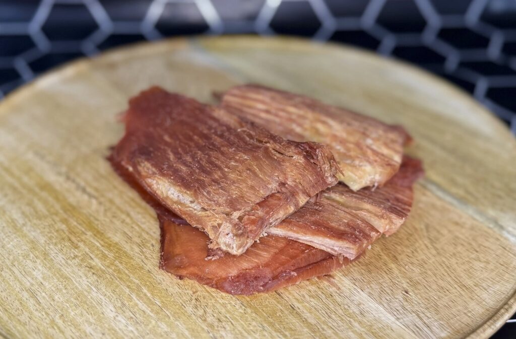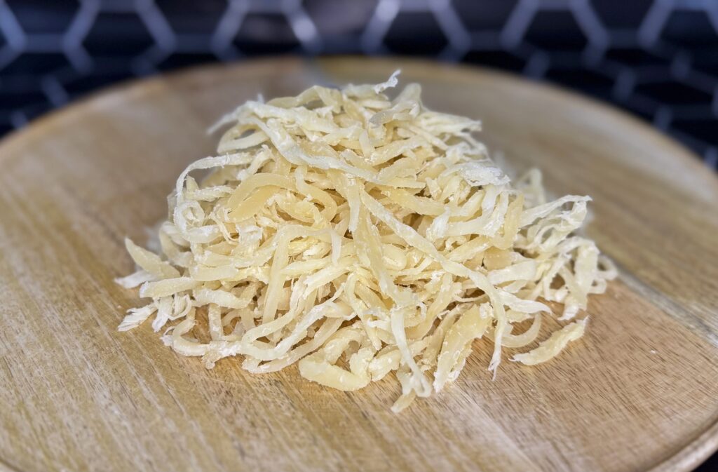 Рибна павутинка — це тонесенька, пікантна соломка зі сушеної риби путасу, яка виглядає як ніжні волокна. Вона має насичений смак, легкий аромат, багато білка та корисних жирних кислот. Готують її зі спеціально підготовленого в’яленого філе риби з додаванням соєвого соусу, перцю та спецій. Ідеальна закуска до пива та просто як ситний перекус.