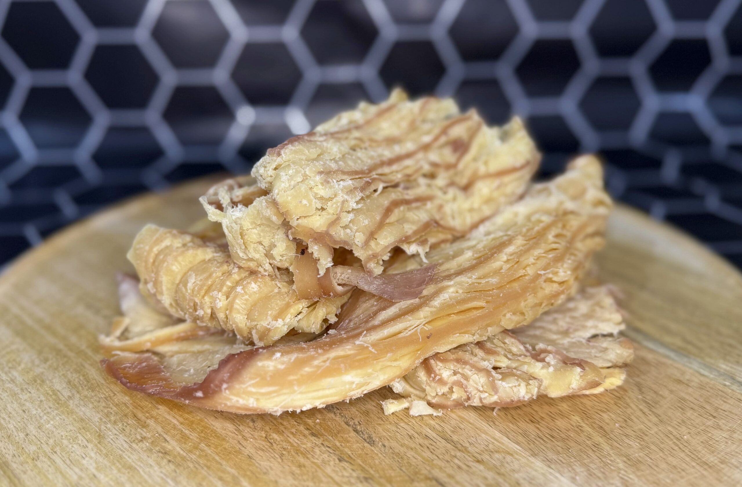 Унікальний делікатес, що являє собою солоно-сушене філе кальмара, обсмажене в арахісовій олії, що надає йому особливий солодкуватий смак та неповторний аромат. Цей морепродукт відрізняється від звичайних сушених кальмарів більш насиченим смаком та маслянистою текстурою.